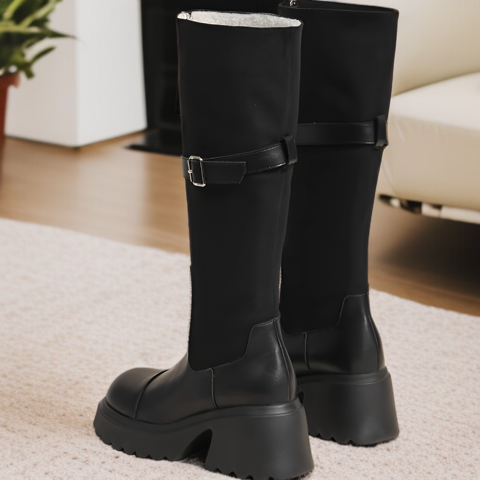 コントラストカラーステッチハイブーツレディース2025秋冬新作フロントジッパーベルトバックル厚底バイクブーツ厚ヒールロングブーツ