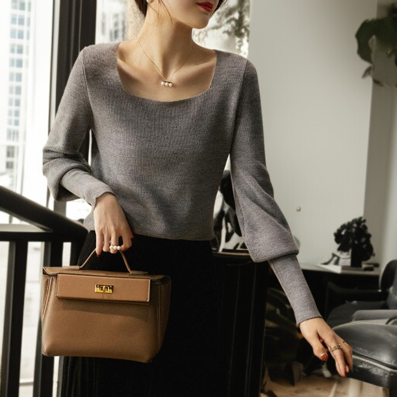 ジャンパー女性気質ニットボトムシャツスクエアネックランタンスリーブニットウェアエレガントなインナートップス